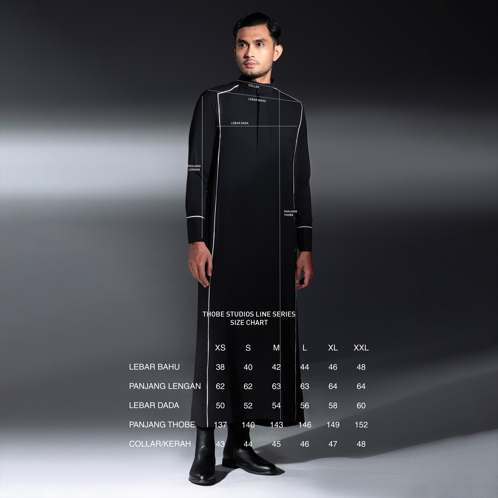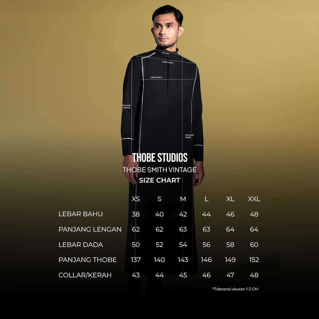 - Size XS : Lebar Bahu 39/Panjang Lengan 61/Lebar Dada 50/Panjang Thoub 137/Kerah 39