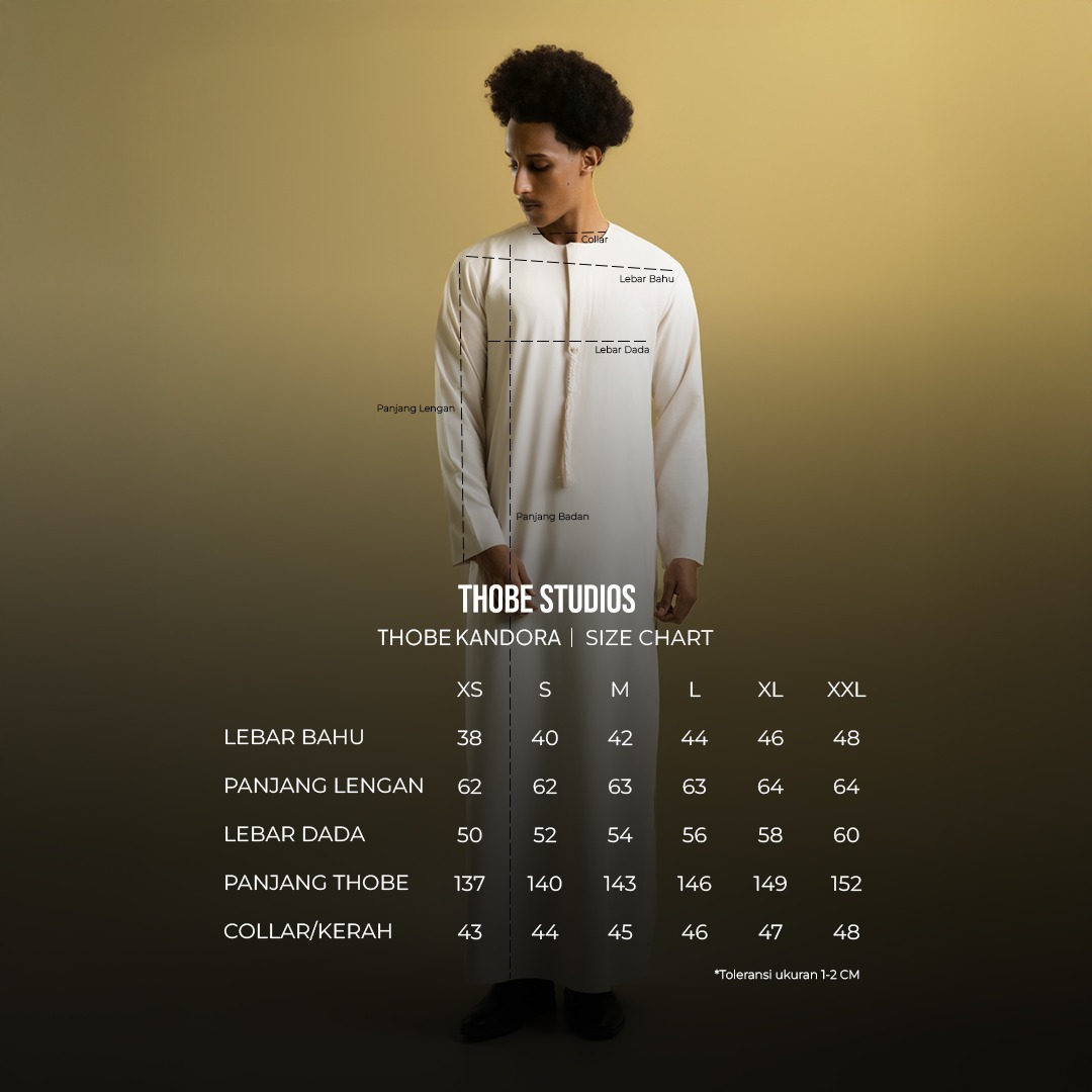 Lebar Bahu 48 / Panjang Lengan 63 / Lebar Dada 58 / Panjang Thobe 150 / Kerah 48
