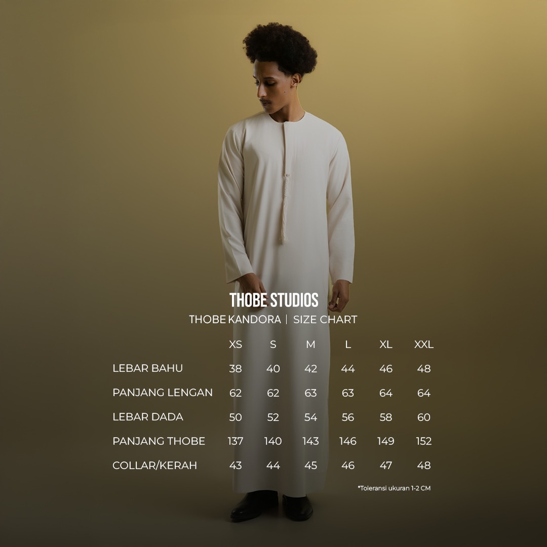 Lebar Bahu 38 / Panjang Lengan 61 / Lebar Dada 49 / Panjang Thobe 135 / Kerah 43