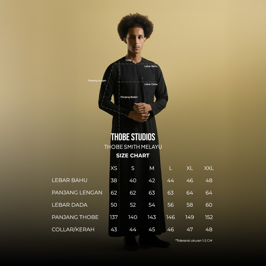 Thobe Smith Melayu hadir dengan sentuhan desain khas yang elegan dan berkarakter, dipadukan dengan pendekatan modern ala Thobe Studios. Detail desain yang rapi dan proporsional menjadikan thobe ini tampil sopan, berwibawa, dan tetap relevan untuk berbagai kesempatan.